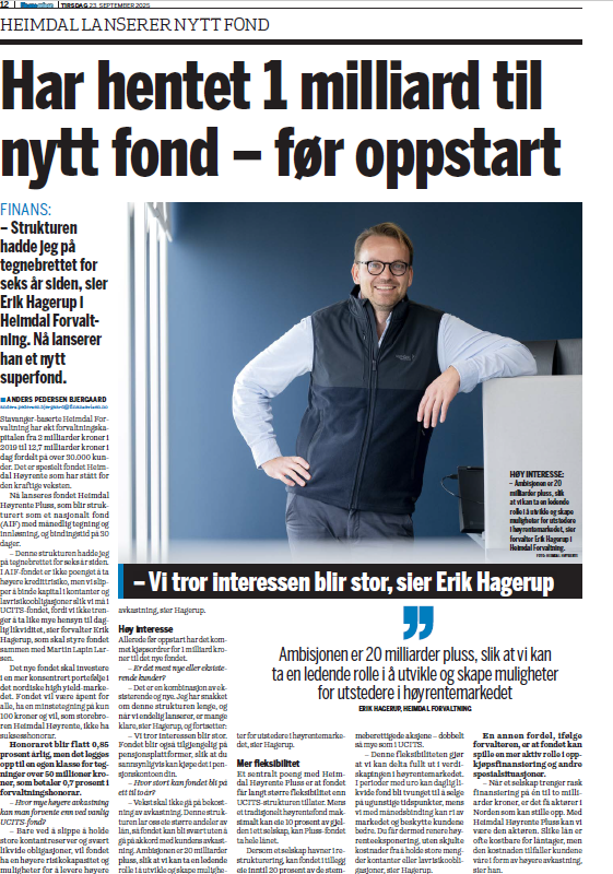 – Når et selskap trenger rask finansiering på én til to milliarder kroner, er det få aktører i Norden som kan stille opp. Med Heimdal Høyrente Pluss kan vi være den aktøren. Slike lån er ofte kostbare for låntager, men den kostnaden tilfaller kundene våre i form av høyere avkastning, sier han.